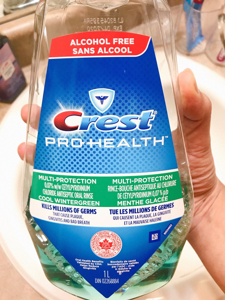 Lastly, I finish my routine by using Crest Pro-Health Mouthwash. I fill 1/4 of its cap and gargle by mouth effectively. This again is an extra step I take towards my cleaning and refreshing process. I like my mouth to smell good, clean and refreshing. You can totally skip this step but what’s the harm anyways?
